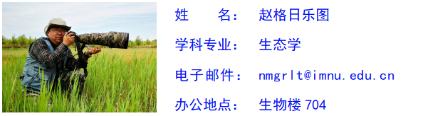 赵格日乐图,男,蒙古族,中共党员,博士,教授,生态学(动物生态学)学术研究生导师,学科教学(生物学)专业硕士导师,蒙古国教育大学外聘博士生导师。中国动物学会鸟类学分会会员,内蒙古动物学会理事会常务理事,内蒙古自然资源学会理事会理事。2015年入选内蒙古自治区新世纪“321”人才工程第二层次。主要研究方向为鸟类生态学及野生动物保护管理。主持完成国家级科研项目1项、省部级科研项目3项、地厅级科研项目2项,科技合作横向项目4项;参与完成国家级科研项目4项,省部级科研项目1项、国际合作项目1项;现主持科技合作横向项目3项。国内外学术期刊上已发表学术论文40余篇。出版学术著作有《内蒙古达赉湖自然保护区鸟类区系及群落生态学研究》(主编,2012)、《宁夏灵武白芨滩国家级自然保护区综合科学考察报告》(副主编,2018)、《乌海百鸟》(副主编,2018)、《内蒙古两栖爬行动物》(主编,2021)和《内蒙古保护动物》(主编,2021)。主编蒙文教材有《脊椎动物学实验指导》(2012)和《脊椎动物学》(2015),参编教学参考书2部,科普译著1部。学校第五届和第六届“中青年教师教学技能大赛”中分别获一等和二等奖,内蒙古自治区第六届“青年教师课堂教学技能竞赛”中获三等奖。“脊椎动物学”教学课件2010年和2011年分别获自治区第五届民族教育科学研究成果二等奖和学校第十届教学成果一等奖(集体成果)。编写的教材《脊椎动物学实验指导》2014年获学校优秀蒙古文教材一等奖。2015年获学校科研成果三等奖。2016年被评为学校蒙古语教育教学先进个人,课程讲授被学校评为“精彩一课”。2018年荣获学校“五四共青团最佳支持者奖章”。编写的教材《脊椎动物学》2019年获学校优秀蒙文教材二等奖。指导的研究生毕业论文曾荣获学校优秀学位论文,被评为学校优秀研究生指导教师。曾荣获学校优秀共产党员和优秀班主任等。承担本科生“动物学”、“动物学实验”、“动物学实习”等课程,承担研究生的“动物生态学研究进展”、“动物生态学研究方法”、“生物地理学”、“鸟类学”等课程。