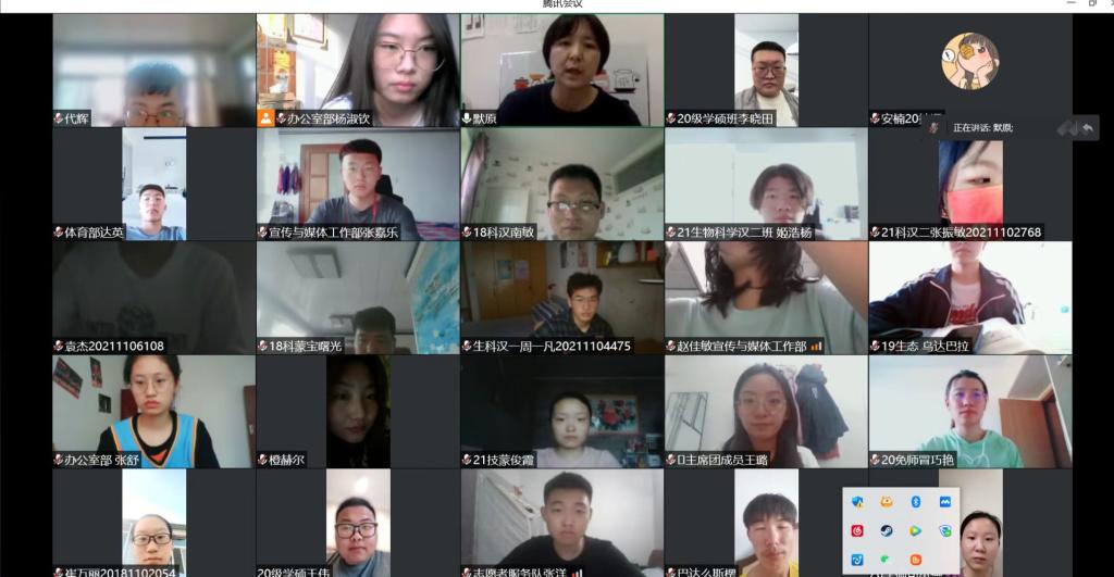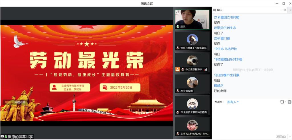 5月20日,必赢国际437官网召开了“劳动教育宣传月”活动交流推进会,分为研究生专场和本科生专场分别在线上召开,学就办主任默原老师、团总支副书记李自蹊老师、辅导员胡日查老师出席了会议。在两场会议上,学就办组织学生干部深入学习了习近平总书记在全国教育大会上的讲话精神和自治区相关文件,分别向研究生和本科生学生干部解读了我院《“学生劳动教育宣传月”实施细则》,并就近期我院所开展的“劳动教育宣传月”的活动进展进行了阶段性汇报,并听取了学生会各部门在实施劳动教育宣传活动的工作进展和各班实施劳动教育的典型做法。