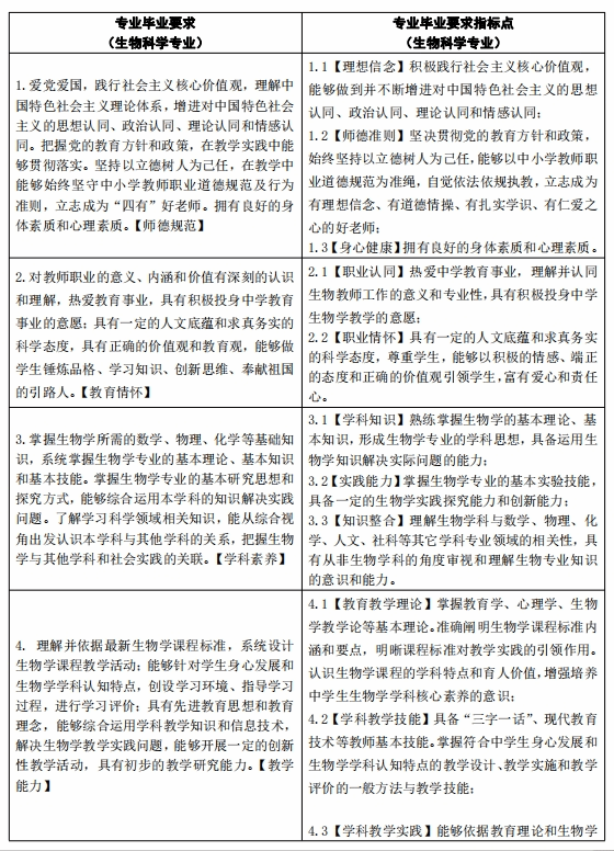 目标4:熟悉生物学学科发展趋势,形成专业发展意识,树立终身学习理念,进行学习和专业发展规划;了解国外生物学教育改革发展的趋势和动态,能够借鉴国际先进教育理念进行教育教学;具有一定的创新意识,能够运用批判性思维方法分析和解决教育教学问题;能够开展合作教研,持续提升教学能力和水平。