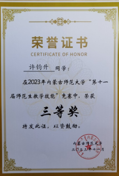 必赢国际437官网“第十一届师范生教学技能”竞赛于2023年11月4—5日在盛乐校区隆重举行,在本次比赛中,我院经过层层选拔,选派2020级生物科学汉2班的裴琦钰、许钧升和2021级生物科学蒙班的苏日娜共三名同学参加了本次技能大赛,指导教师为李景环、牛艳芳、高峰和乌云高娃。经过赛前师生的精心准备和赛场上的激烈角逐,最终裴琦钰同学获得二等奖,许钧升和苏日娜同学获得三等奖。 奖获者荣誉证书 二等奖获得者合影 三等奖获得者合影