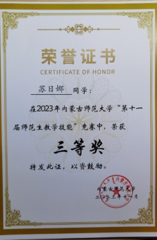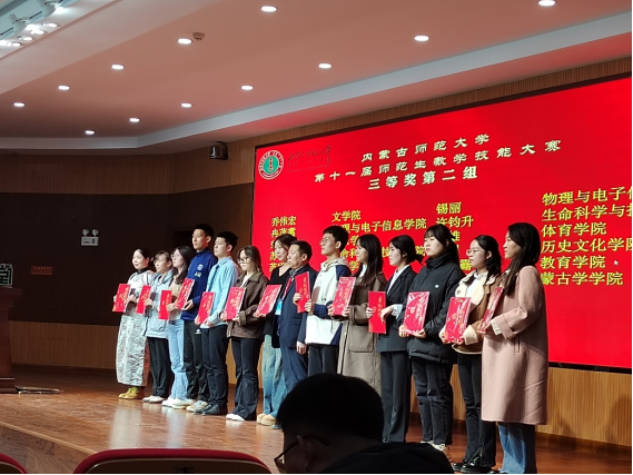 必赢国际437官网“第十一届师范生教学技能”竞赛于2023年11月4—5日在盛乐校区隆重举行,在本次比赛中,我院经过层层选拔,选派2020级生物科学汉2班的裴琦钰、许钧升和2021级生物科学蒙班的苏日娜共三名同学参加了本次技能大赛,指导教师为李景环、牛艳芳、高峰和乌云高娃。经过赛前师生的精心准备和赛场上的激烈角逐,最终裴琦钰同学获得二等奖,许钧升和苏日娜同学获得三等奖。