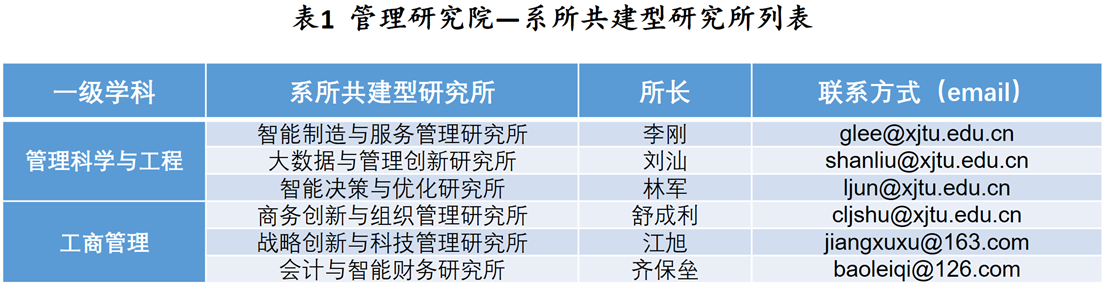 管理研究院依托管理科学与工程、工商管理两大一级学科,以各系前沿学科方向为支撑设六大系所共建型研究所。六大研究所由汪应洛院士、席酉民教授、徐宗本院士、管晓宏院士、杨善林院士和陈晓红院士担任学科带头人,由领军学者、青年拔尖人才担任所长,相关专业方向中青年骨干教师为成员。